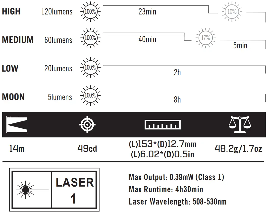 - When the battery level is less than 5%, the maximum output is limited to 5 lumens.
