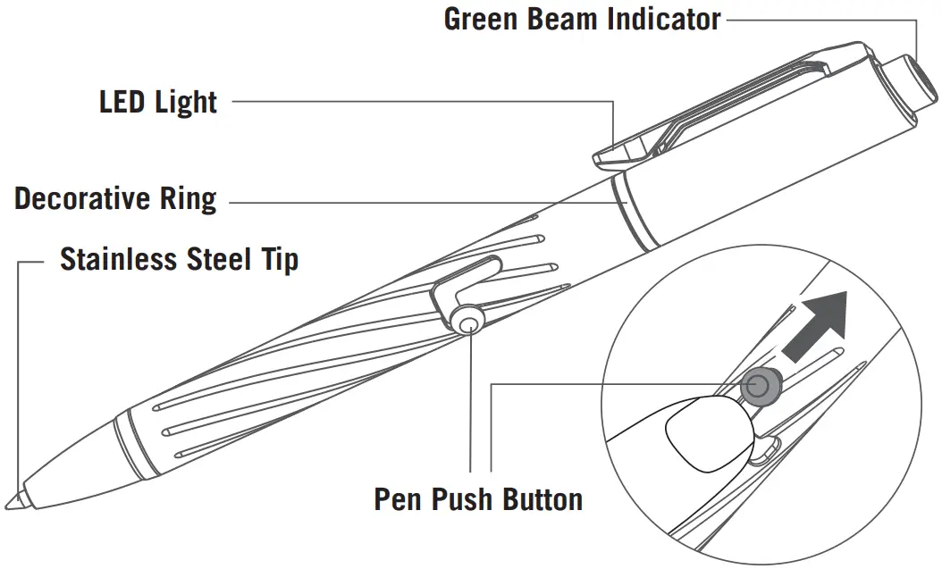 Gently slide the pen push button along the L-shaped track to the bottom, the tip will appear and be locked, then you can start writing. Release the pen push button to the top of the L-shaped track, the tip will bounce back into the pen.