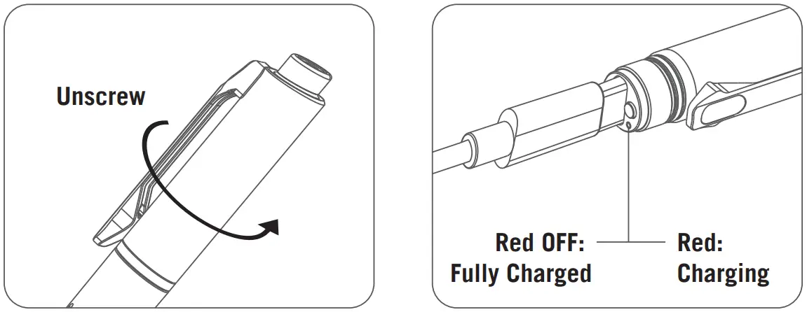 Before first use, please fully charge the product. Unscrew the pen from the middle and store the lower part (pen). Connect the upper part to the USB power supply or computer USB port via the provided charging cable (USB power supply not included. Users can use any USB power supply of digital devices or household appliances). The indicator lights up red to indicate charging, and the red will go out when it is fully charged.