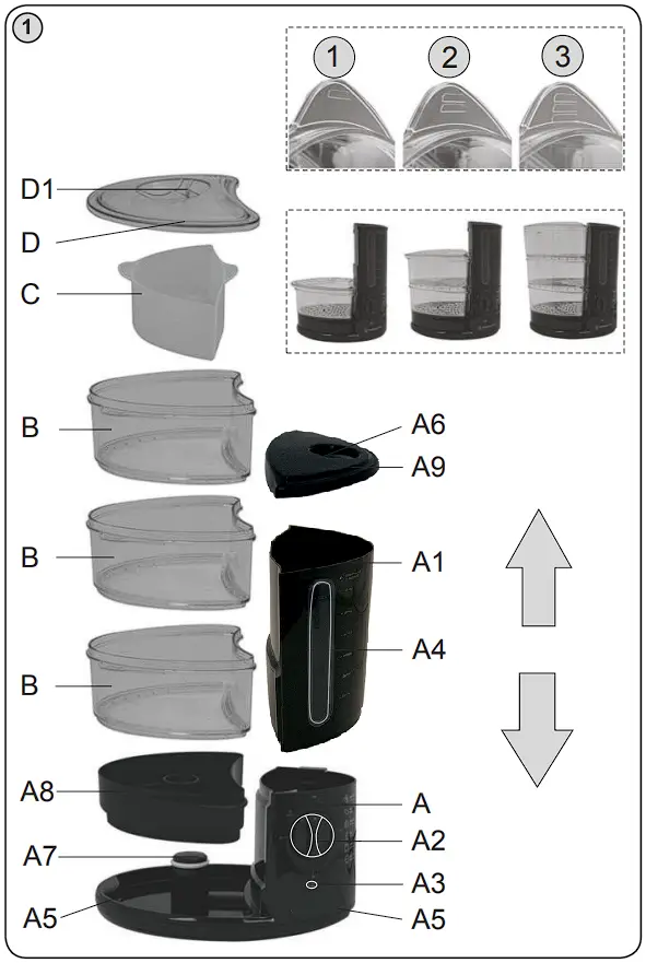 5) Cooking bowls B: they are numbered for easier reference. Place bowl 1 as the first one on the base and place bowl 3 as the last one.