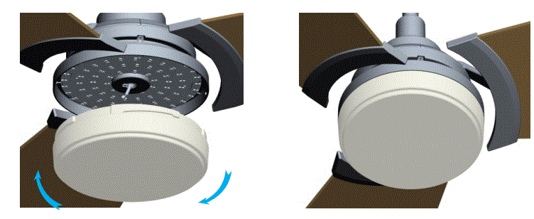 Installing the Lampshade: Confirm the LED light wire molex connecting with the light board block terminal, and fix the lampshade into the light kit pan by rotating clockwise. Warning: To prevent SERIOUS INJURY or DEATH, make sure that lampshade is properly secured. Allow the lampshade to cool completely before removing.