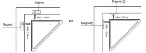 - The magnet and the main sensor must be less than 1.6cm apart for the small magnet installation or 2.5cm apart for the big magnet installation. Main se be affixed to the door or window and the magnet must be affixed to the frame. The magnet and the main sensor must separate when the door or window opened.