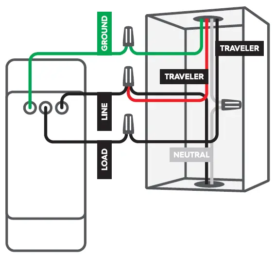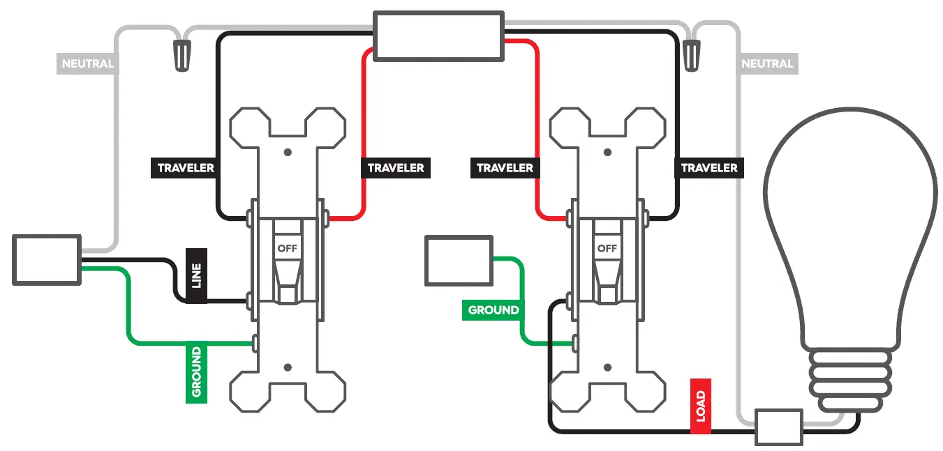 When installing a 3-Way with our 3-Wire, No-Neutral switches, your traveler wires can be used interchangeably. In this example, we’ll use the red traveler with line and the black traveler with load, but you can switch that if you’d like. We’ll explain more further down.