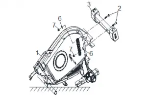 Attach the front stabilizer (3) to the main frame (1) with 2 screws (2), 2 washers (6) and 2 nuts (7).