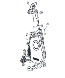 Connect the center console cable to sensor cable 1 (16) and sensor cable 2 (21). Attach the console bracket (29) to the main frame (1) with the screw (23) and washer (8).