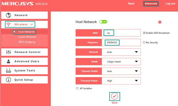Go to Advanced-Wireless-Host Network. The SSID on the top of the page is the local wireless network of this router. You can name whatever you like. And you can create your own Password to secure the local wireless network of the router itself. Then click on Save.