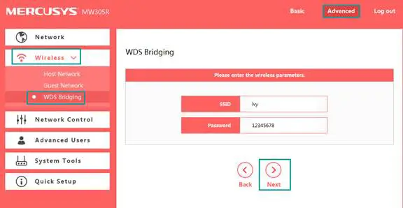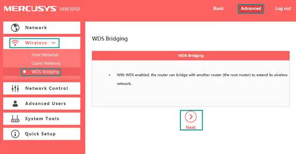 Go to Advanced->Wireless->WDS Bridging, and click on Next.