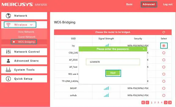 Select your own wireless network name from the list and type in the wireless password of your main router. Click on Next.