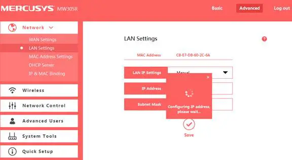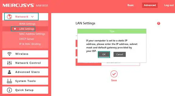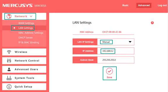 Note: It is suggested to change the router’s IP Address to be in the same network of the root network. For example, if your root router’s IP Address is 192.168.0.1, while our router’s default LAN IP Address is 192.168.1.1, we need to change our router’s IP Address to be 192.168.0.X (2<0<254).