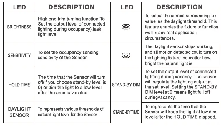 - Bi-level with daylight Control function, a natural light level higher/lower than daylight sensor setpoint to light off/on MUST keep at least 1 minute, that will turn off/on the light automatically.