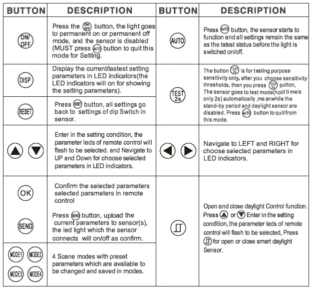 NOTE: the led light that the sensor connects will be on/off after getting the new parameter as confirmed. NOTE: If you press a button, the remote led indicators will show the latest parameters which