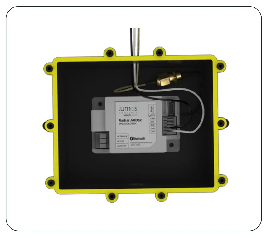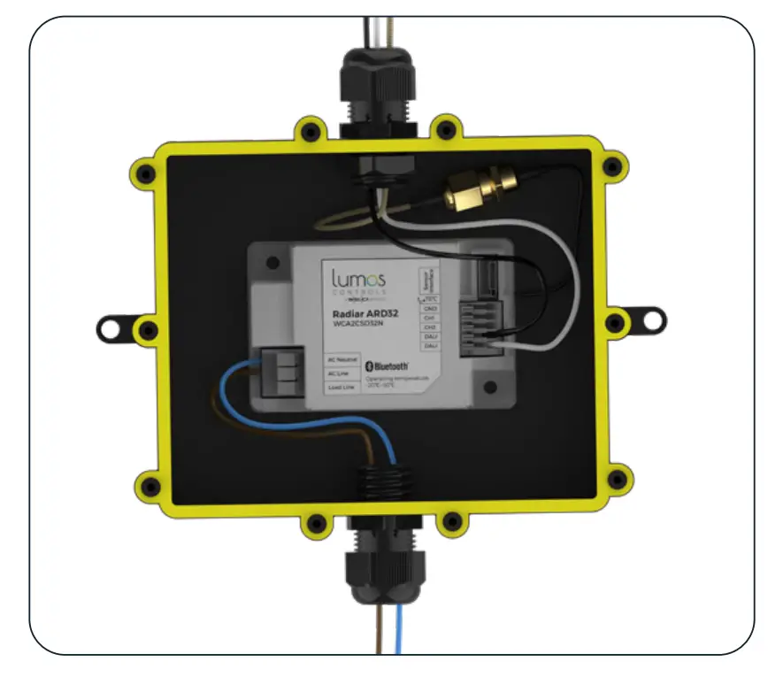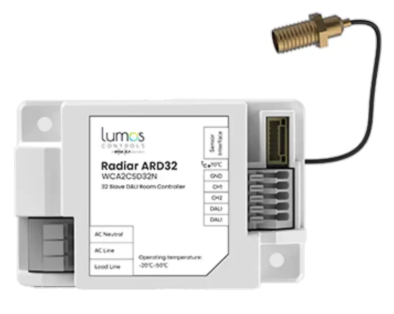 Radiar ARD32 is a DALI room controller which can be connected to a maximum of 32 DALI LED drivers. It is a part of the Lumos Controls ecosystem, including controllers, sensors, switches, modules, drivers, gateways, and analytical dashboards.