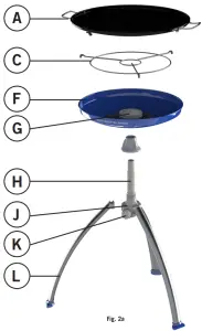 - Place the burner pan (F) on the stem and tri pod assembly.