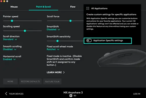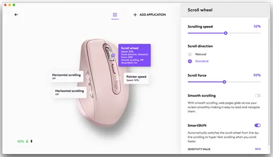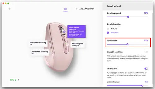 By default, a mode shift is assigned to the button on top of the mouse. In Logitech Options software, you can decide to disable SmartShift if you prefer to stay in one scrolling mode and always shift manually. You can also adjust the SmartShift sensitivity, which will change the speed required to automatically shift into free spinning.