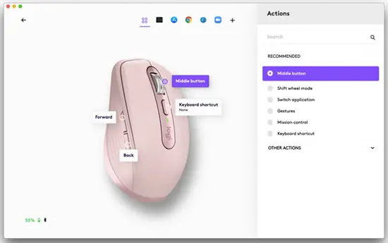 Your mouse buttons can be assigned to perform different functions for different applications. For instance, you can assign the side buttons to control volume in Spotify, copy/paste in Microsoft Excel, or undo/redo in Adobe Photoshop. When you install Logitech options, you can install predefined app-specific settings that will adapt the mouse button behavior to the selected applications. Here are the app-specific settings we have created for you.