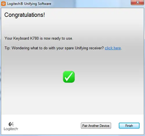 7. Click Finish to exit the Logitech Unifying Software (or Pair Another Device to pair additional devices). Your device should now be connected.