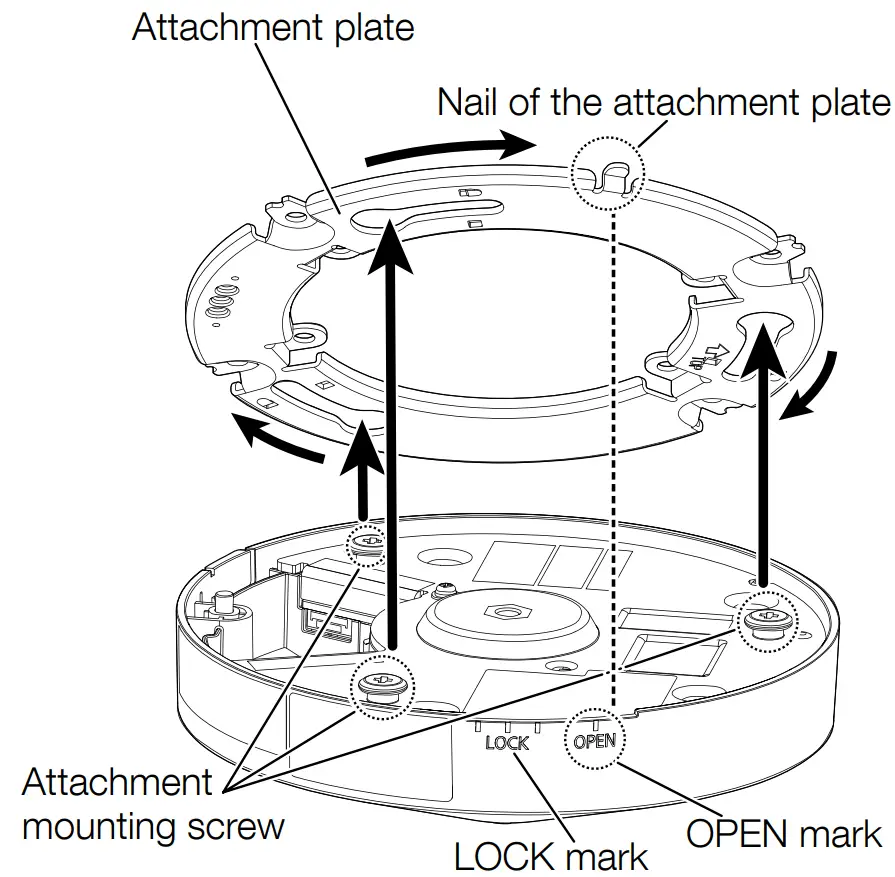 - Align the OPEN mark of the side of the camera with the nail of the attachment plate, insert3 attachment mounting screws into the attachment plate, and rotate the camera by approximately 20° and temporarily fix it. (Align with the “I” at the center of the LOCK mark with the position of the nail of the attachment plate).