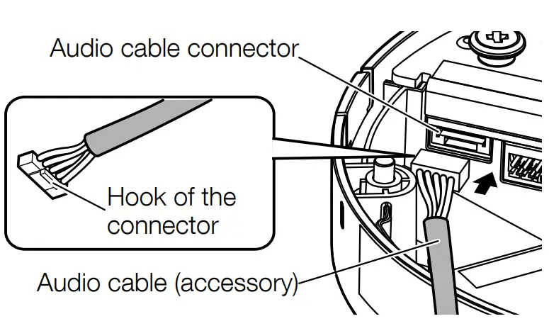 • When disconnecting the audio cable (accessory), pull out the audio cable while holding down the hook of the connector. - When mounting the camera on using the ceiling mount bracket (locally procured).