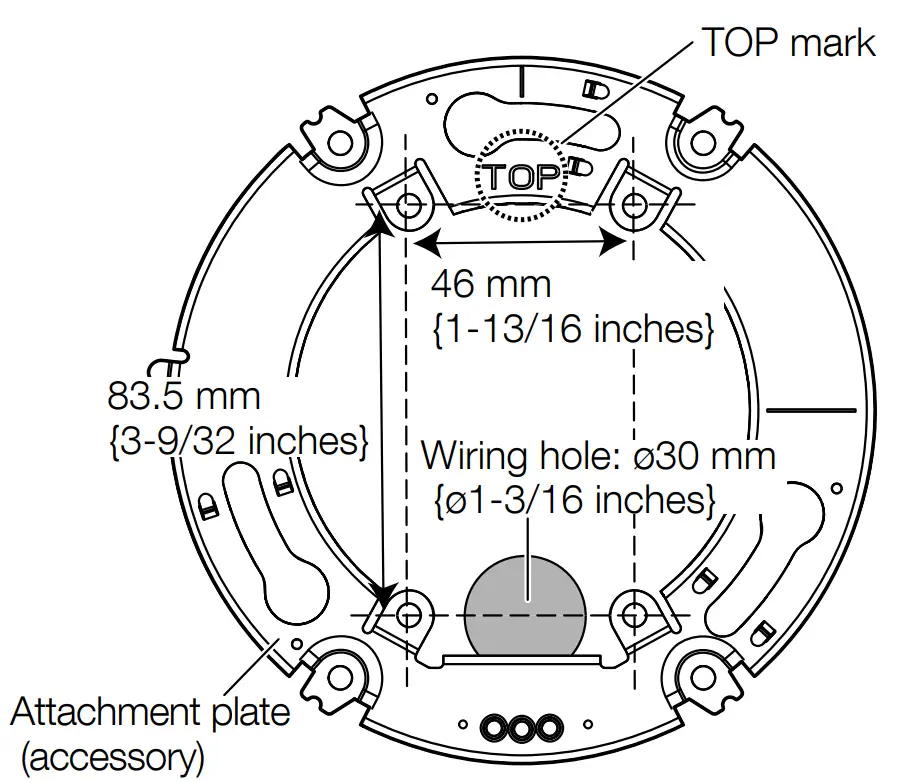- Attach the attachment plate (accessory) so that the “TOP” mark faces toward the opposite side of the attachment face (camera installation side).