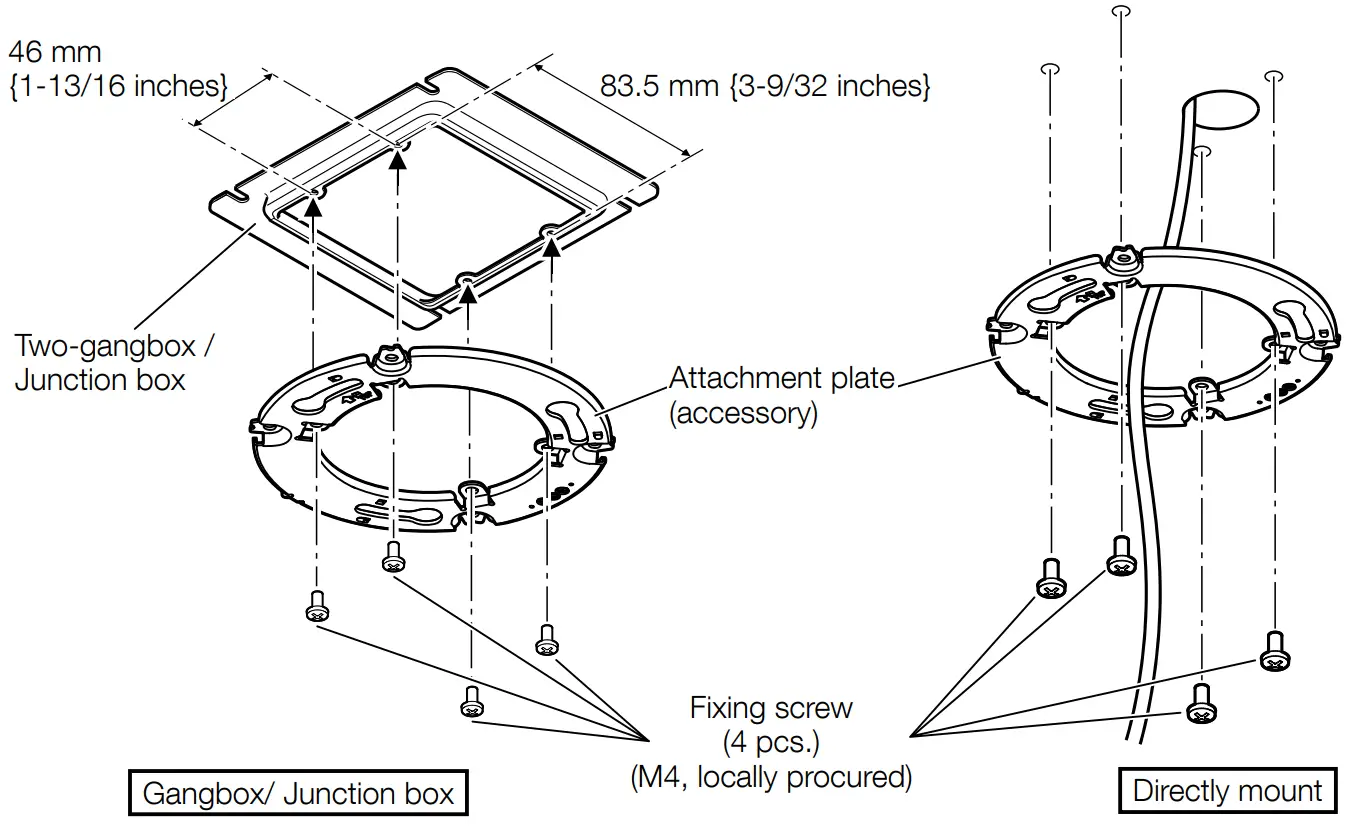 : Mount the camera on the two-gangbox/ junction box using the attachment plate | M4 x 16 mm*3 {5/8 inches} x 4 pcs. | 196 N {44 lbf} |