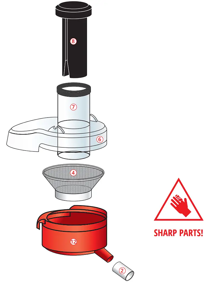 - Use the food pusher ❽ to gently guide the food down the feed chute ❼ to extract the maximum amount of juice.