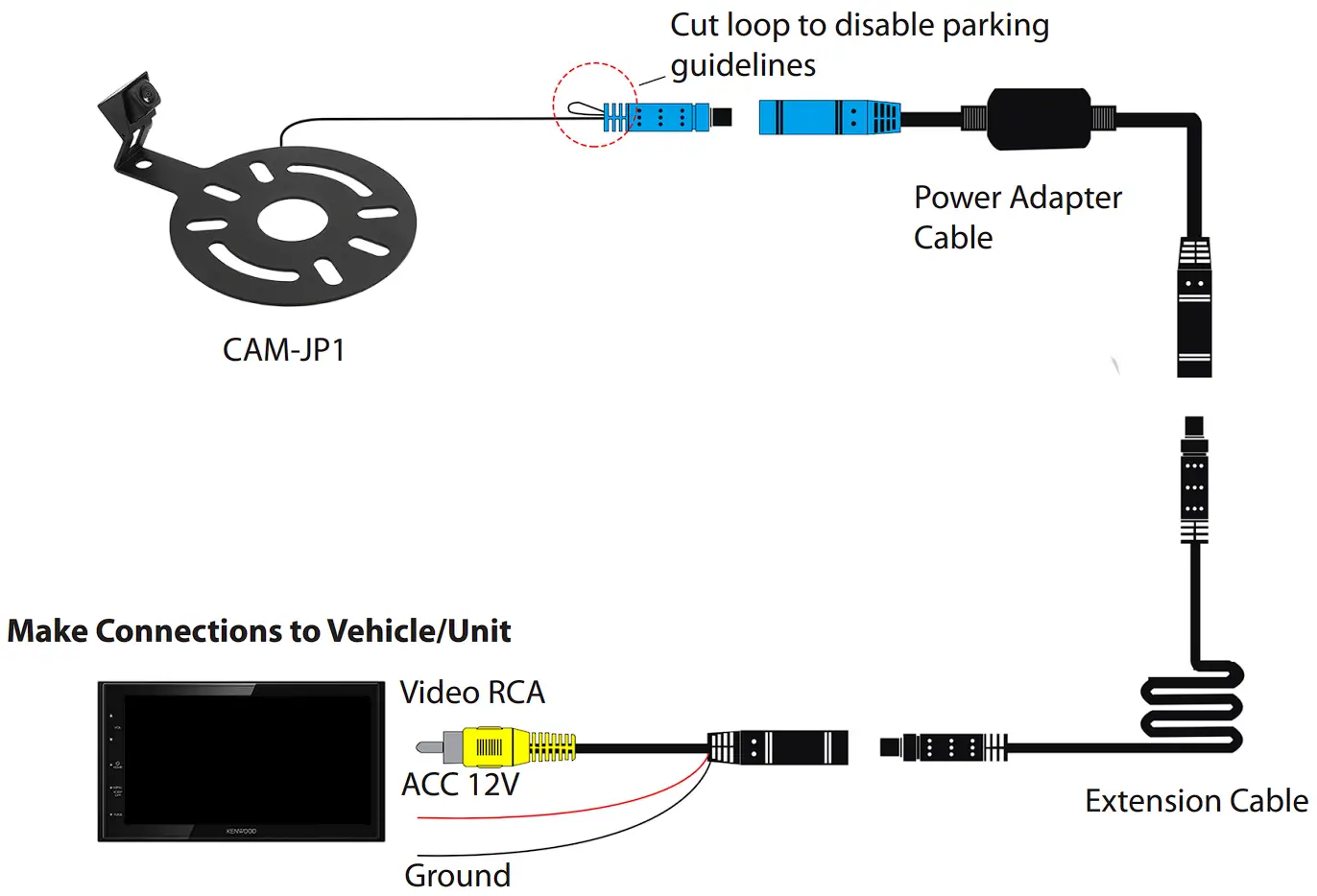 Note: to remove the parking line feature, cut the small looped wire which is located on the camera connection cable. - Attach the black connector from the ‘power adapter cable’ to either side of the ‘6m extension cable’.