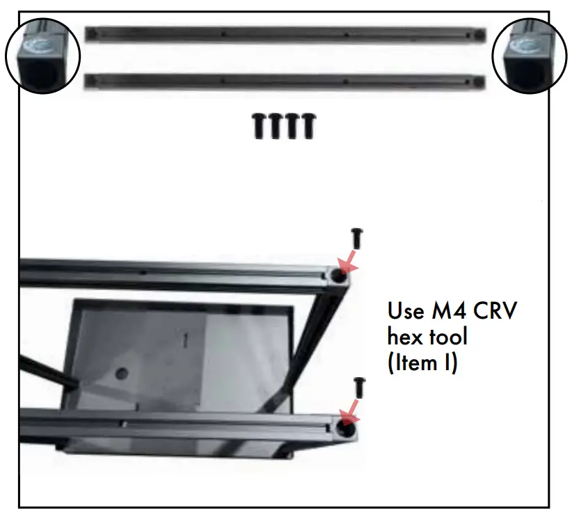 - Use M4 CRV hex tool (Item I) to attach screws to thevertical extrusions