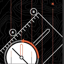 Turn the compass housing until the red part of the north/south arrow is parallel with the map meridians and points north on the map.