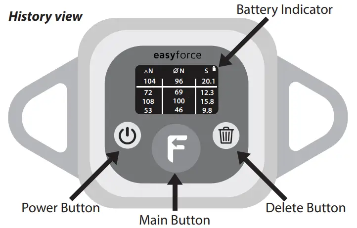 Step 4 – To save the measurement and return to the history view, press the main button. Alternatively, press the delete button to return to the history view without saving. Press the power button to switch off the device. If the device is idle for two minutes, it will automatically shut down to conserve power. To delete measurements from the history view, press the delete button once to highlight the latest measurement [6], and press the delete button again to delete the entry. Pressing any other button cancels the deletion.