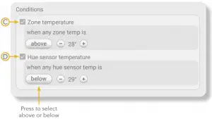 This condition will be satisfied when the hue sensor temperature is above or below the set temperature. This requires a Licensed Hue Bridge.