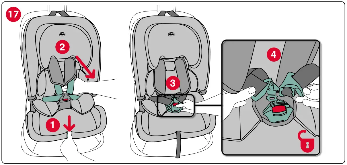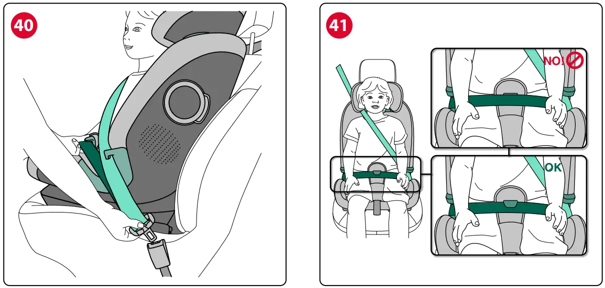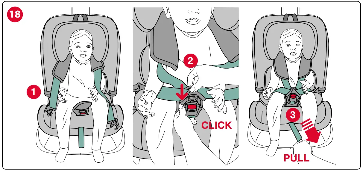 - Periodically check that the child has not opened the safety buckle on the car seat and that he/she is not playing with any part of the buckle.