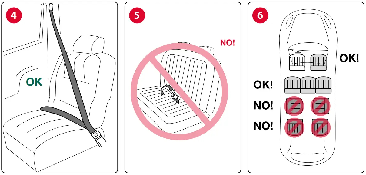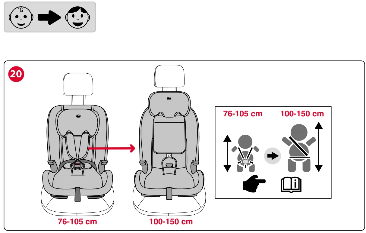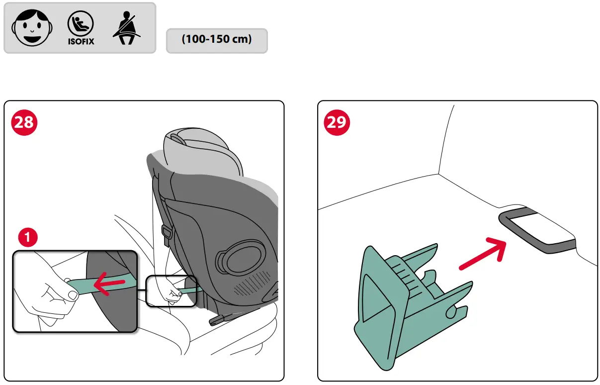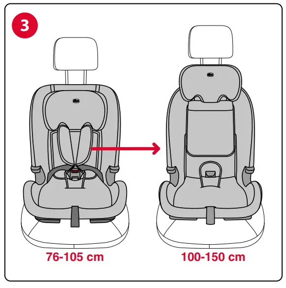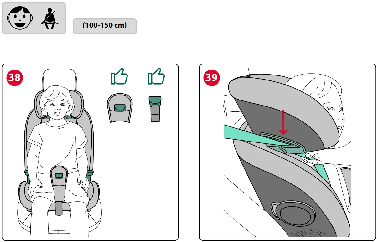 100-150 cm: When using the car seat in vehicles equipped with rear vehicle seat belts with integrated airbags (inflatable seat belts), follow the car manufacturer’s instruction manual.