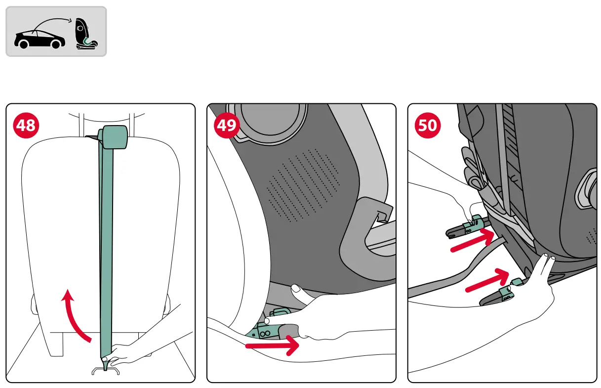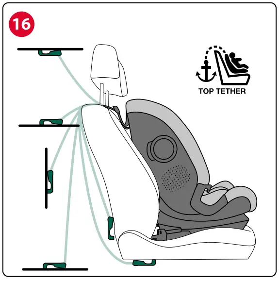 WARNING! DO NOT use the Top Tether from 100 to 150 cm. - If the vehicle is not fitted with Isofix anchorage, the MySeat i-Size can be installed (in the 100-150 cm configuration) front-facing with a 3-point adult safety belt, approved according to UN/ECE Regulation No. 16 or equivalent.