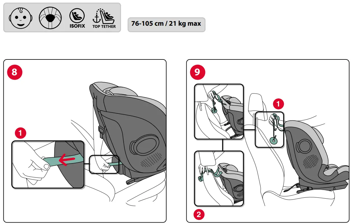 - From 76 cm to 105 cm it must be installed on seats equipped with the Isofix System and Top Tether. The maximum weight of the child must be 21 kg.