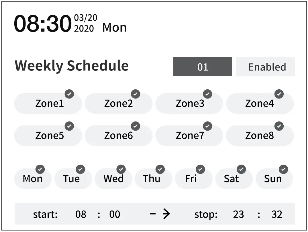 is put on the No .. - For each timer program, user can select the related zones and days. For each timer program, the zones and days involved can be set. Press