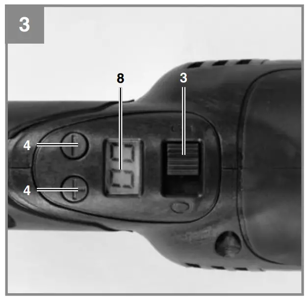 Use the speed control to set the desired working speed. Press the “+” button to increase the speed. Press the “-” button to decrease the speed. Refer to the display (8) for the set speed. Set speed = Display x 100