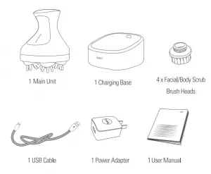 The package includes: 1 Main Unit, 1 Charging Base, 4 x Facial/Body Scrub Brush Heads, 1 USB Cable, 1 Power Adapter, 1 User Manual