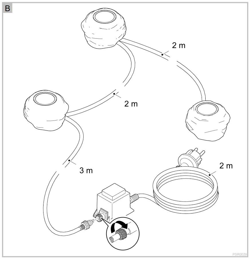 – Max. immersion depth: 1 m - Connect the connection cable of the LED spotlights to the transformer socket by means of the plug.
