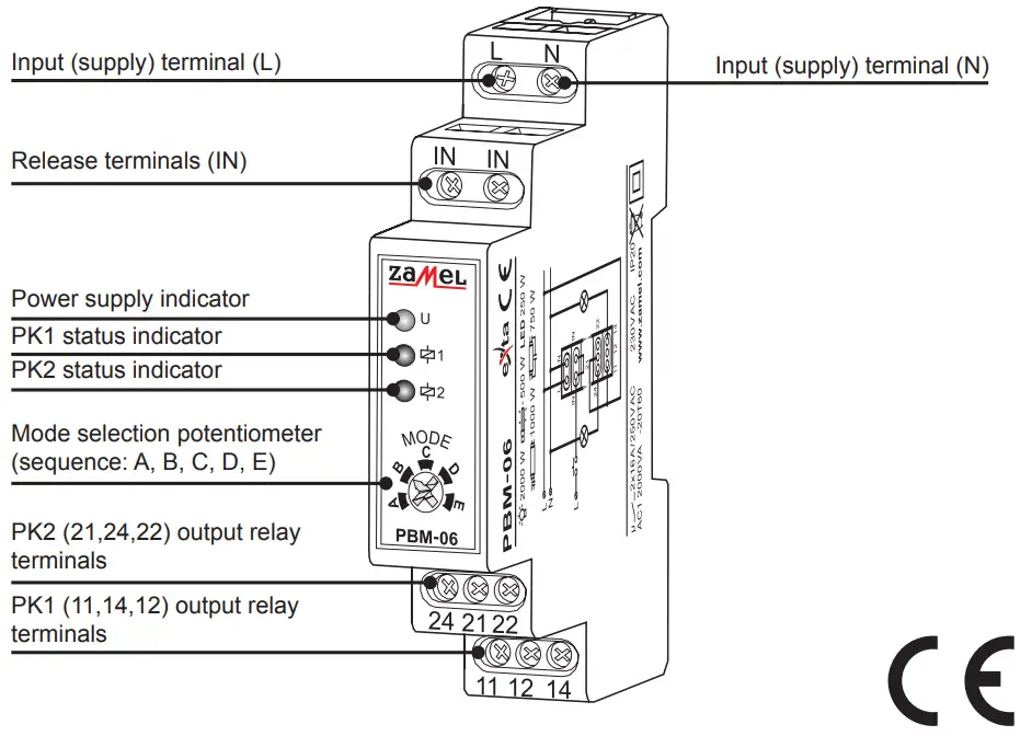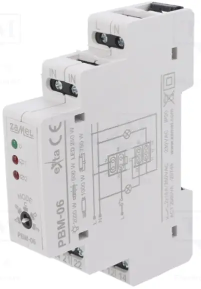 The PBM-06 bistable relay is used to control lighting or any other device by means of unipolar push buttons connected in a parallel way. The relay is equipped with two independent outputs activated in accordance with a selected impulse sequence given to the (IN) inputs. It allows to control two circuits / branches simultaneously. A potentiometer, placed on the front panel, is used to choose a sequence (1 out of 5). The control impulse can only be the “L” line signal. The trigger input structure enables cooperation with backlit push buttons (including LED backlight). The total current of backlight for the IN input can not exceed 1,5 mA. The device is designed to be mounted in distribution boards (TH35 rail).
