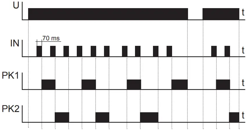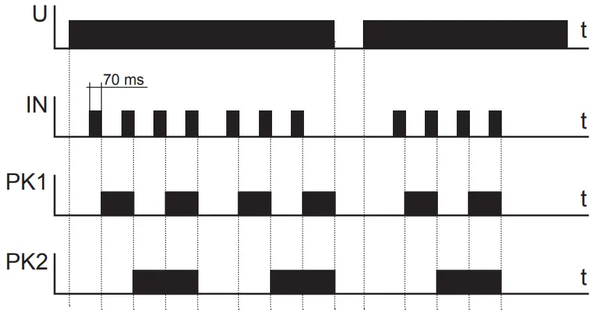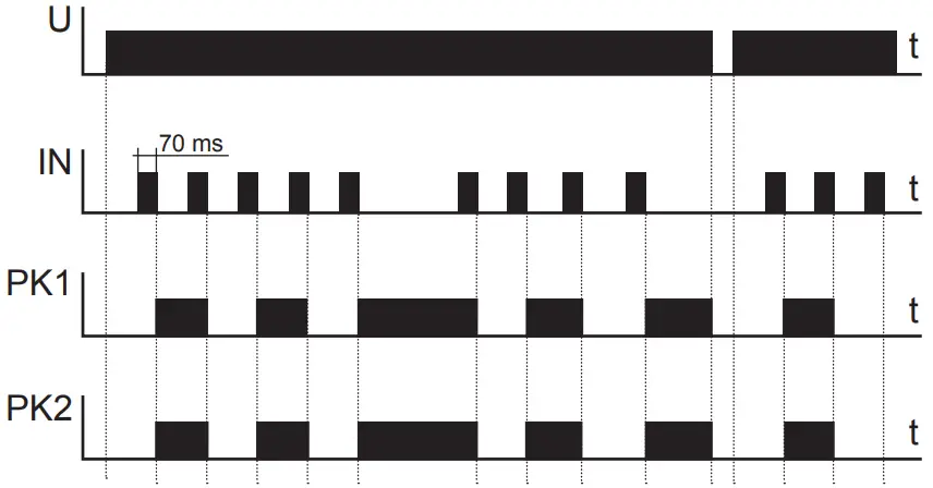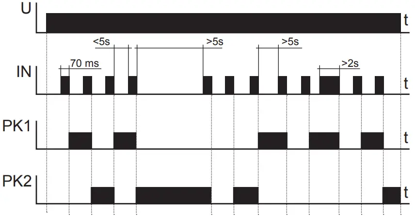 After supply voltage has been applied or after its decay both relays PK1 and PK2 are switched off. In Mode B, in case the subsequent impulses are given to the (IN) input in intervals shorter than 5 seconds, the device operation will include the following sequences: