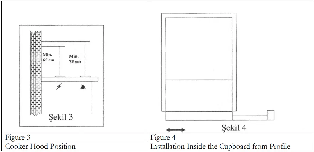 When the installation is completed, there shall be a distance of minimum 65 cm between the product and the electrical ovens and minimum 75 cm between the product and the ovens operating with other fuel. (Figure 3)