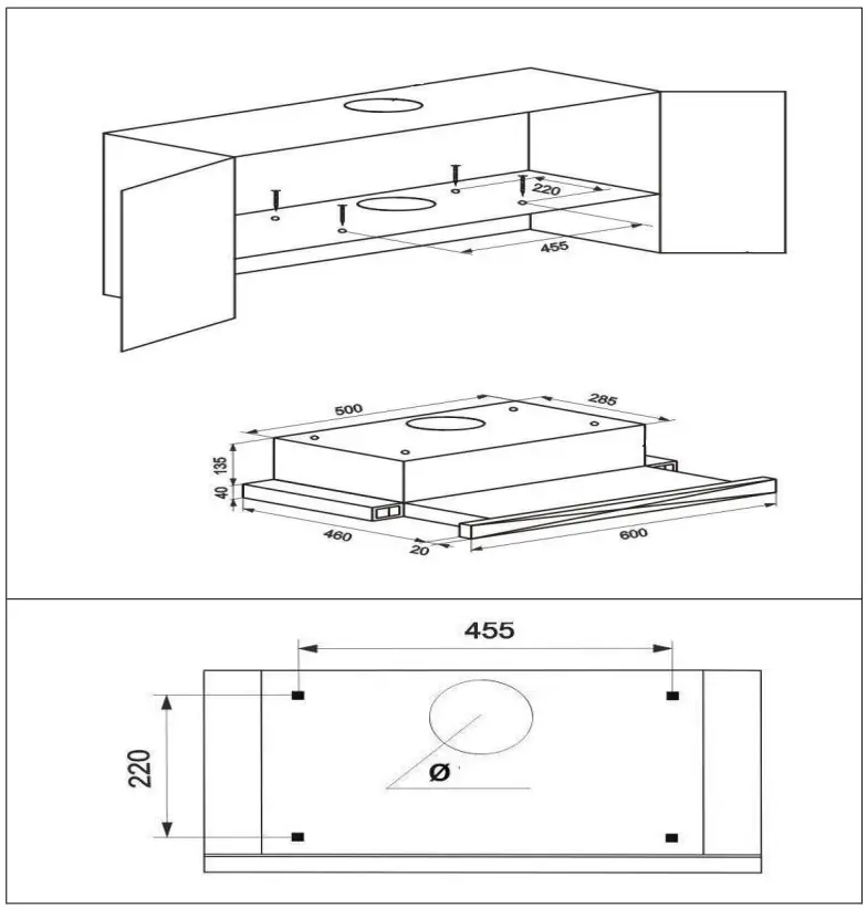 For use without chimney (recirculation mode) The air is filtered by a cartage carbon filter and given into the ambiant again via a pipe with a diameter of 100 mm pipe or chimney from or over the cupboard. This method is employed in the kitchens without any chimneys or the places with chimney but the not suitable for installation.