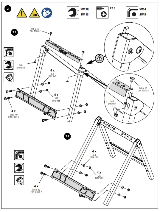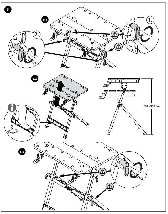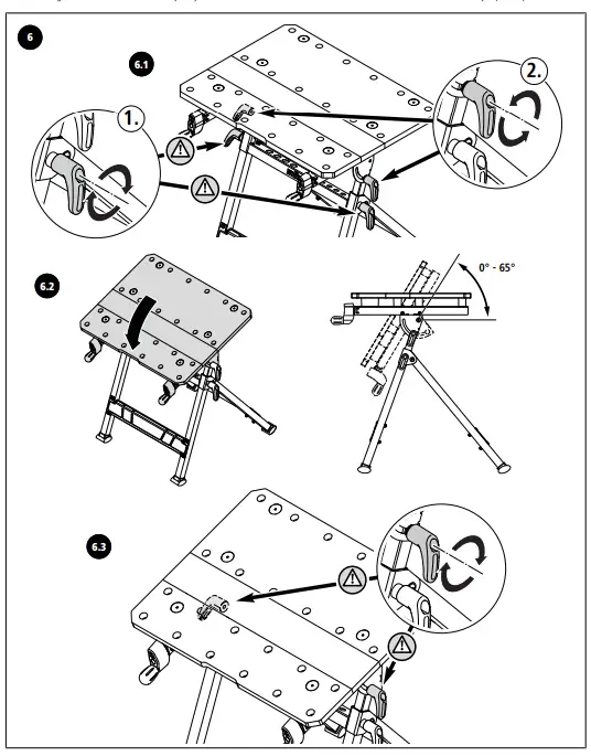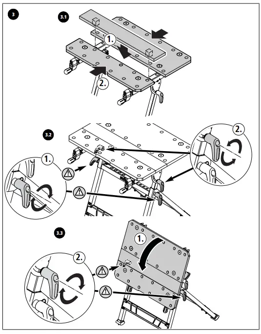 - Assemble the working table correctly and check that all the handle screws and screw joints are tight before beginning work. Correct assembly ensures that the table does not fold up and the table top does not tilt unintentionally.