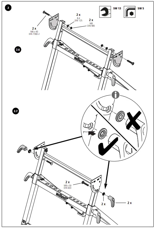 On the left and right respectively, install a swivel plate on the two telescopic tubes, using the bolts, washers and nuts shown in the illustration. When fastening the swivel plates in place, make sure that the openings in the swivel plates face towards the wolfcraft logo on the tool ledge (Fig. 2.6).