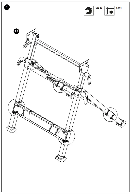 Fold open the two legs and mount the two lower struts between the legs. Make sure that the protruding flat spring of the right leg is on the inside. Screw in the bolts and nuts by hand; they will be tightened later (Fig. 2.1 and Fig. 2.2). Mount the tool ledge between the legs