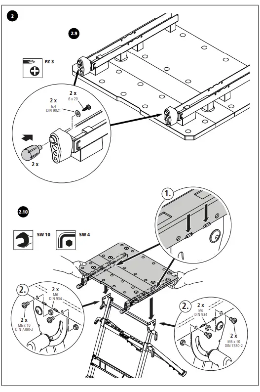 Place the worktop section on the lower section. Make sure that the grooves in the worktop section engage in the spring clips of the swivel plate. Put in the bolts and nuts and fasten the worktop section onto the lower section (Fig. 2.10).