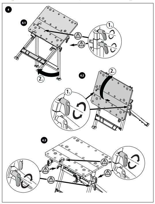 Fold out the footpiece to the limit stop und rest the table on both footpieces (Fig. 4.1). At the left and right, release the two handle screws at the swivel plate and swivel the worktop section to the horizontal position (Fig. 4.2). Fix the worktop section in place by tightening the two handle screws again. Subsequently make sure that the table is standing securely (Fig. 4.3).