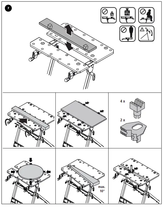 - Do not use the working table as machine table with a clamped power tool (e.g. circular handsaw, router), nor as machine stand (e.g. cutting stand, drill stand, crosscut and mitre saw).