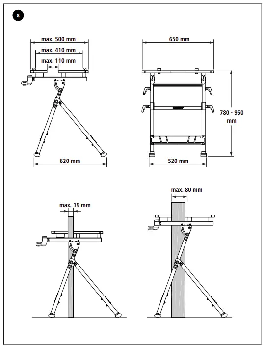 | Clamping area for long objects that are standing on the floor (Fig. 8): | 19 – 80 mm |