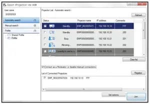 If you don’t see the projector you want, click the Automatic search button to find the projector automatically, click the Manual search button to enter the projector’s IP address, or click the Profile button to find the projector based on a previously saved profile. - If you see a message asking for a keyword, enter the four digits that appear on the LAN standby screen and click OK.